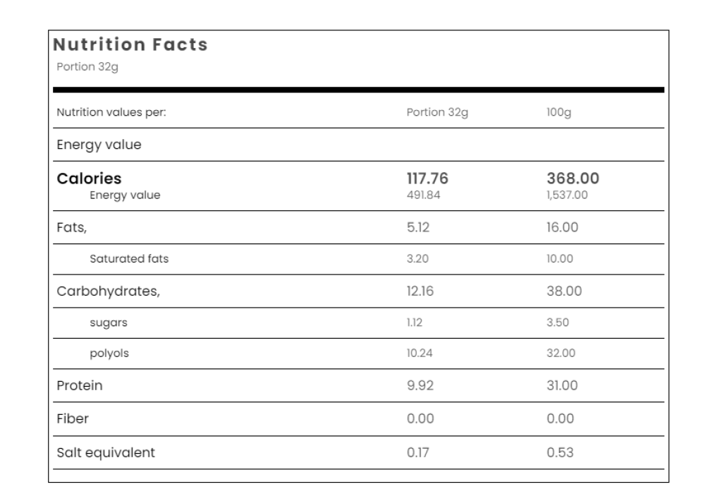 - الكربوهيدرات الأخرى: 21 جرام (عادةً بوليولات)